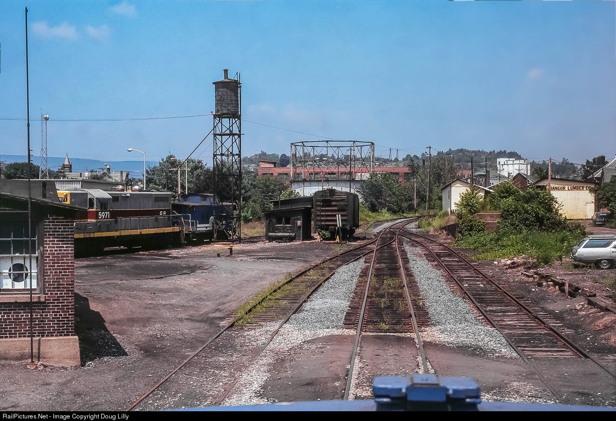 As Conrail train ABP-1 progresses northward from the south end of Bangor yard. it passes the site of the recently-demolished roundhouse. The sheds of the now-defunct Bangor Lumber Company still exist as part of a storage facility, but much else in this scene is gone. All of the tracks except the main have been removed, as has the sanding tower and yard office to the left. The ex-EL GP7 and the Erie box car at the sanding tower were scrapped years ago, and the landmark gas storage tank has been leveled.