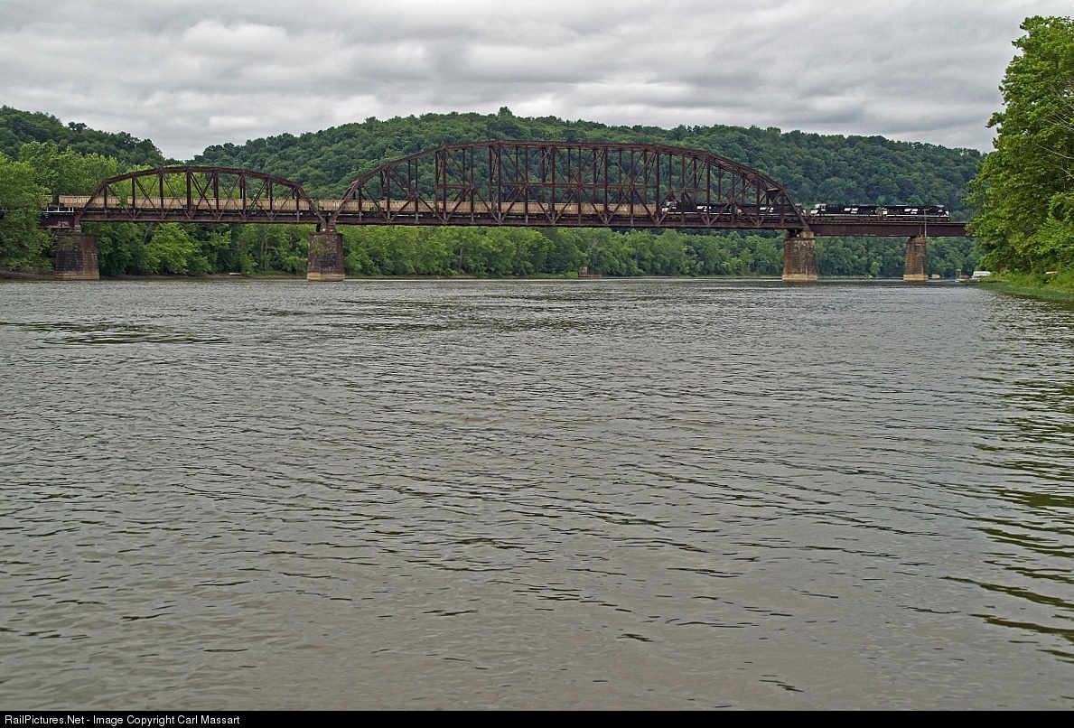 Empty hoppers from the Keystone Power Plant in Schelocta are headed for Shire Oaks yard located on the Mon River. This bridge is the third bridge constructed at this location to cross the Allegheny River. The original bridge was a single track wood truss structure built in 1866. The second bridge was located just upstream slightly(foreground). It was single track also and became a bottleneck as rail traffic increased. This double track bridge, of which one track has been removed, was built in 1915 in about 9 months, including the piers. The construction of the lock and dam system on the Allegheny River required an elevation change of the main line. To see a better view of the bridge structure, click HERE. After crossing the Allegheny, the Conemaugh Line skirts along the Kiskimentas and Conemaugh Rivers before joining the mainline further east near New Florence, PA. Imagine trying to build a bridge like this today in less than a year.