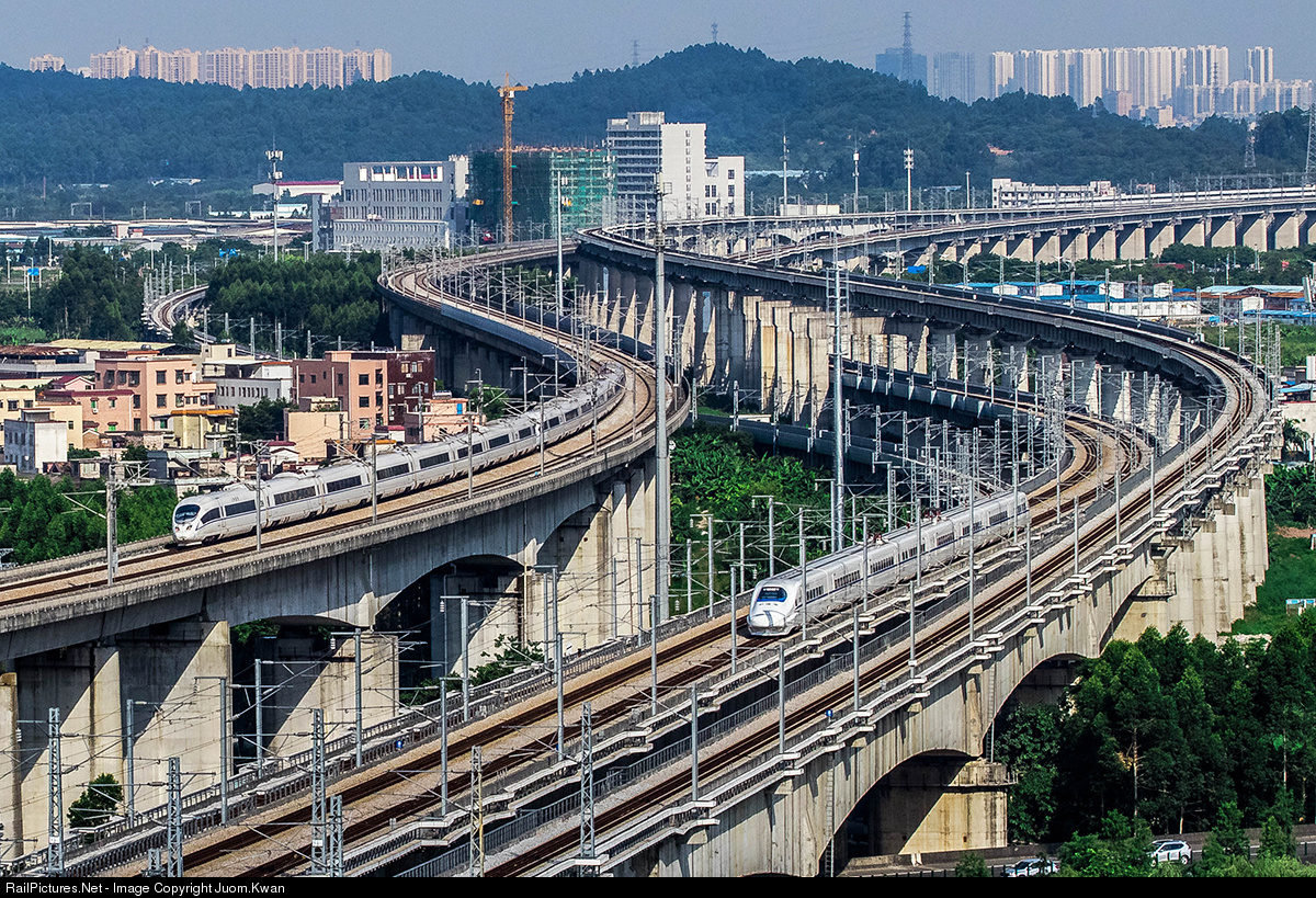 China CNR Tangshan vehicle factory produced CRH3C high-speed EMU, traveling in the Beijing Guangzhou high-speed rail, and in the Guiyang Guangzhou high-speed rail on the China Southern Locomotive Sifang vehicle factory produced CRH2A EMU to the same drag racing