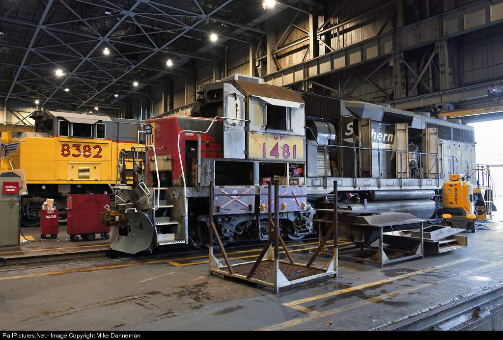 Obviously a former Southern Pacific locomotive, Union Pacific EMD GP40M-2 No. 1481 is in for another overhaul at the railroad’s Jenks Shop at North Little Rock, Arkansas, on May 20, 2015. It will soon emerge fully-repainted in UP colors, complete with a small set of wings on the nose.