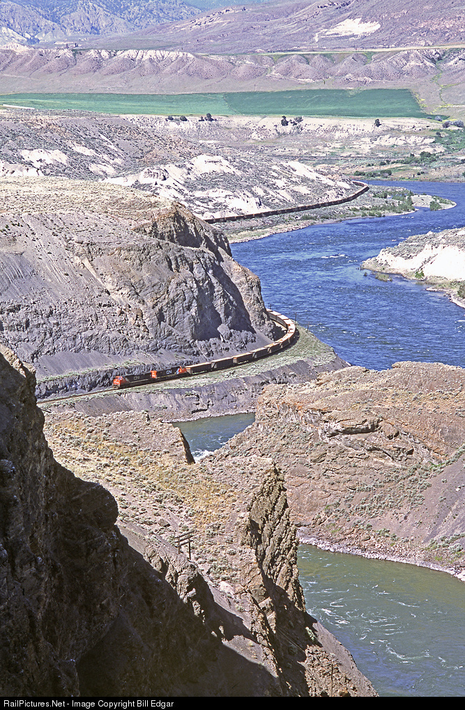 CN 2543 leads a sulphur train into Black Canyon along the Thompson River south of Ashcroft, BC. The train is approaching Basque where it will share CN trackage with CP west to Mission City, BC. Trains go west on CN, east on CP.