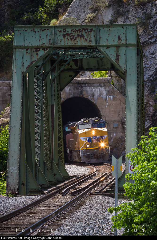 | An eastbound grain train led by Union Pacific ES44AH No. 2565 exits the tunnel on Main 1 at Taggart, Utah in Weber Canyon along UP's Evanston Subdivision on July 24, 2017. |