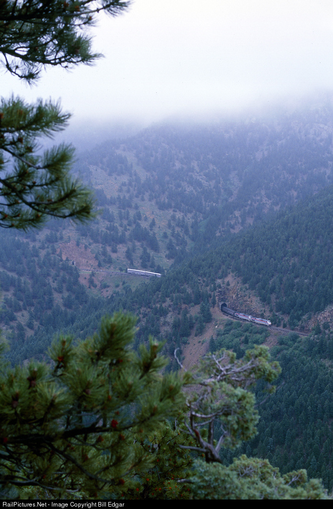 Fog begins to lift as the California Zephyr makes a steady climb threading through the numerous tunnels of the Front Range of the Rocky Mountains after leaving Denver.