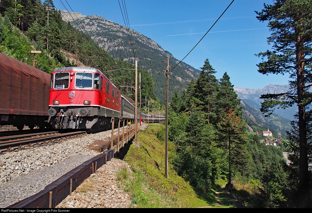 | On September 9th, 2012, the Re 4/4 11128 pulls the IR 2169 Basel SBB - Locarno on the uppermost track at Wassen upwards in direction Göschenen. In a few seconds the train will enter the "Rohrbach" tunnel-bridge. Down in the background on the right you can see the well known church of Wassen and on the left a freight train just is rolling downhill. |