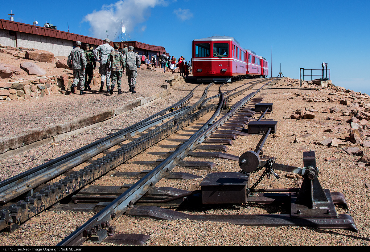 A group of ROTC recruits enjoys some time atop "America's Mountain" while the first train of the day to the top rests after the 9 mile climb up 25% grades from Manitou Springs.