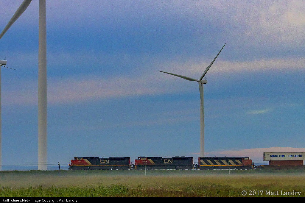 Heading through a bit of fog & mist, CN 120 heads by some turbines, as they approach Amherst, Nova Scotia.