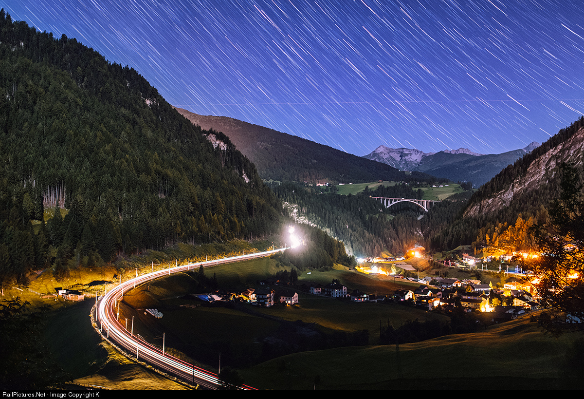 | Night traffic meets in the hairpin of St. Jodok am Brenner. This part of the line climbs steeply, so 3 sharp curves was needed to construct the pass 150 years ago. |