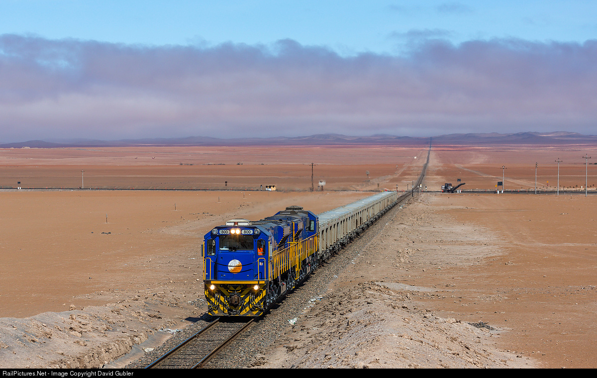 Peru Rail's 800 together with a sister unit hauls empty ore concentrate containers for the Las Bambas mine. In the background, the usual costal fog has crept up from Mollendo towards La Joya, and is only stopped by the dry plains above the coast.