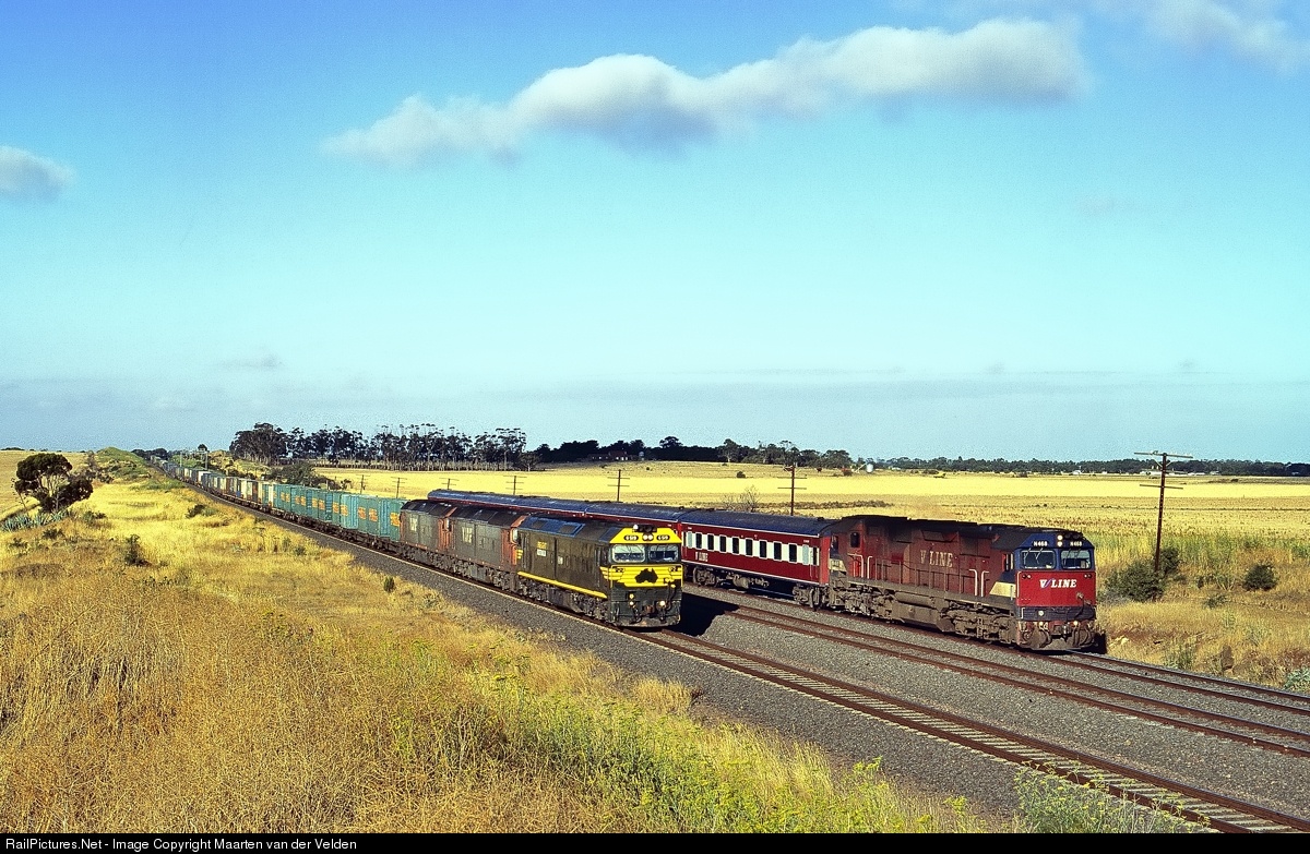 Very much luck for me on that day with these trains running perfectly parallel on the line from Melbourne to Geelong. The left track with normal gauge is used about four times a day in each direction, the broad gauge tracks are better used with about one train an hour in each direction. So it is little chance to get a picture like this. On the photo the locomotives G 519, G 535 and G 532 of Freight Australia with the Toll/TNT 3MA4 / 9753 from Melbourne to Adelaide and the N 468 "City of Bairnsdale" of V/Line Passenger with the train that left Melbourne Spencer Street at 18.28 with destination South Geelong.