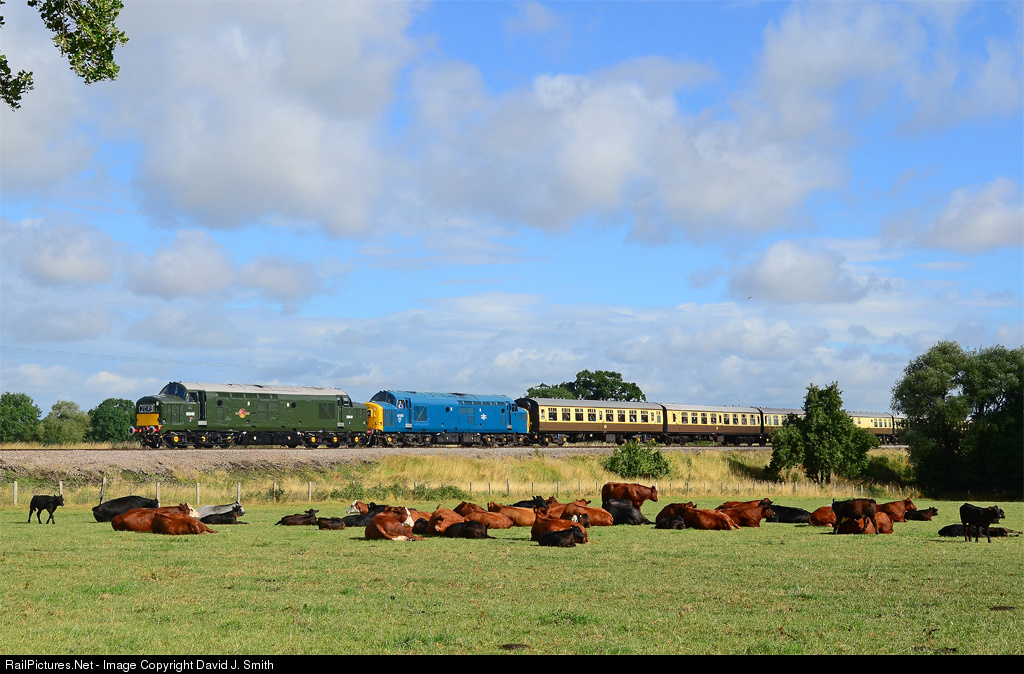 | A pair of preserved Class 37 locos,D6948 and 37215,passing a herd of disinterested cattle as they head the first train of the day out of Toddington. |