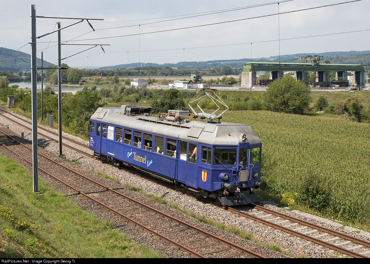 | Former Südostbahn (SOB) railcar ABe 4/4 # 11, built in 1940, since 2001 running for association Tunnelkino as ABe 526 # 290, on the line Laufenburg-Koblenz near Leibstadt on the occasion of the railcar meeting Koblenz on the Swiss National Day. In the background the hydropower station Albbruck-Dogern. The railcar is usually running through the Weissenstein tunnel between Oberdorf and Gänsbrunnen. |