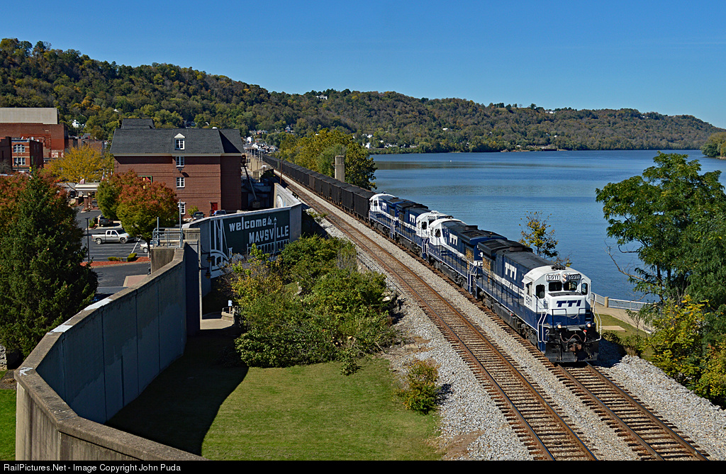 | 4 TTI B36-7's have finishing running around their train and head to the dumper just east of Maysville on a beautiful fall afternoon. Word spread today that a major washout happened on the line and they will not repair it and that CSX had sold the boat they used to move coal on the Ohio River. Word is that the units are also up for sale. A neat Kentucky short line will soon become a thing of the past. |