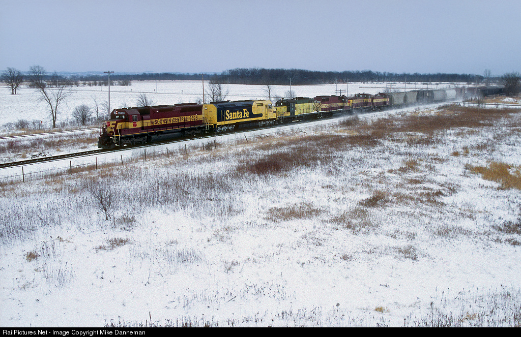 Wisconsin Central train No. 19 approaches Van Dyne, Wisconsin, (north of North Fond du Lac’s Shops yard) on a wintery February 27, 1995. A good assortment of WC EMD locomotives power the westbound (northbound) train—SD45 No. 6598, former Santa Fe F45 No. 5972, former C&NW/FRV GP9 No. 4505, GP35 No. 723, rounded out with a SW1500 and a SW1200.