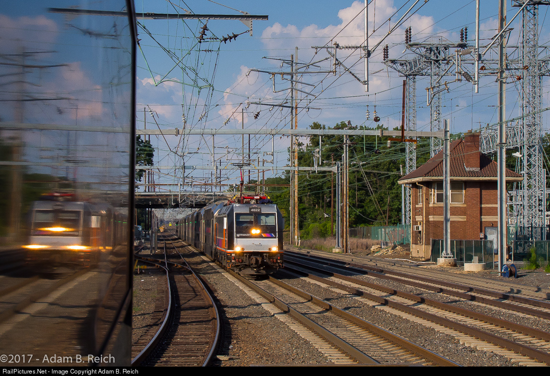 Seeing Double: After ending its revenue run at Jersey Avenue, Northeast Corridor Line Train 3165 deadheads past Princeton Junction Station on Monday, July 31, 2017. As it approaches the Track 4 platform, a sign catches the reflection of ALP-46 #4622. The shuttered Nassau Tower is visible in the background.