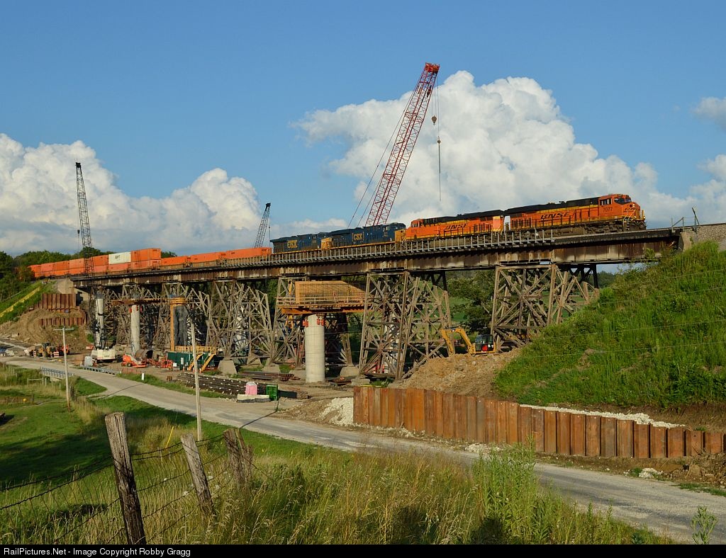 BNSF 7077 leads a intermodal west across the Media trestle. Work on the replacement bridge is well underway.
