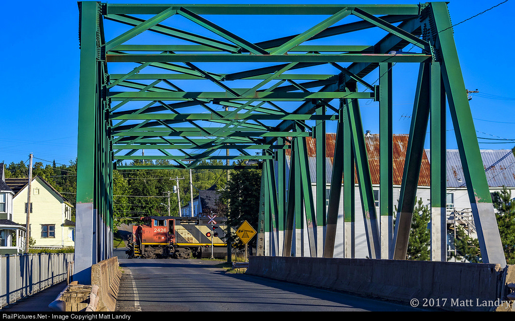 | On a hot Summer evening, eastbound train 406, led by a striped cowl, 2426, heads through "downtown" Norton, New Brunswick. |