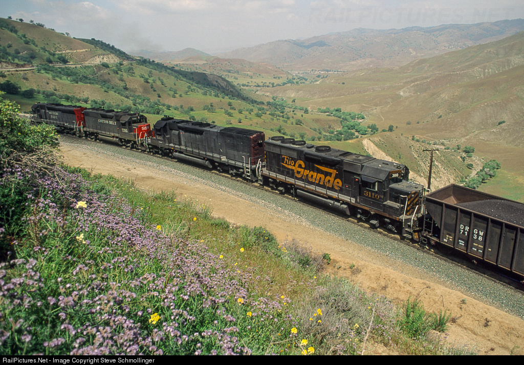 Every one of the nine EMDs on this eastbound SP coal drag--including the four here on the rear--are screaming in notch 8 to lift 10,000 tons up the steep grade at the east end of Cliff. The coal is headed for North American Chemical in Trona, CA.
