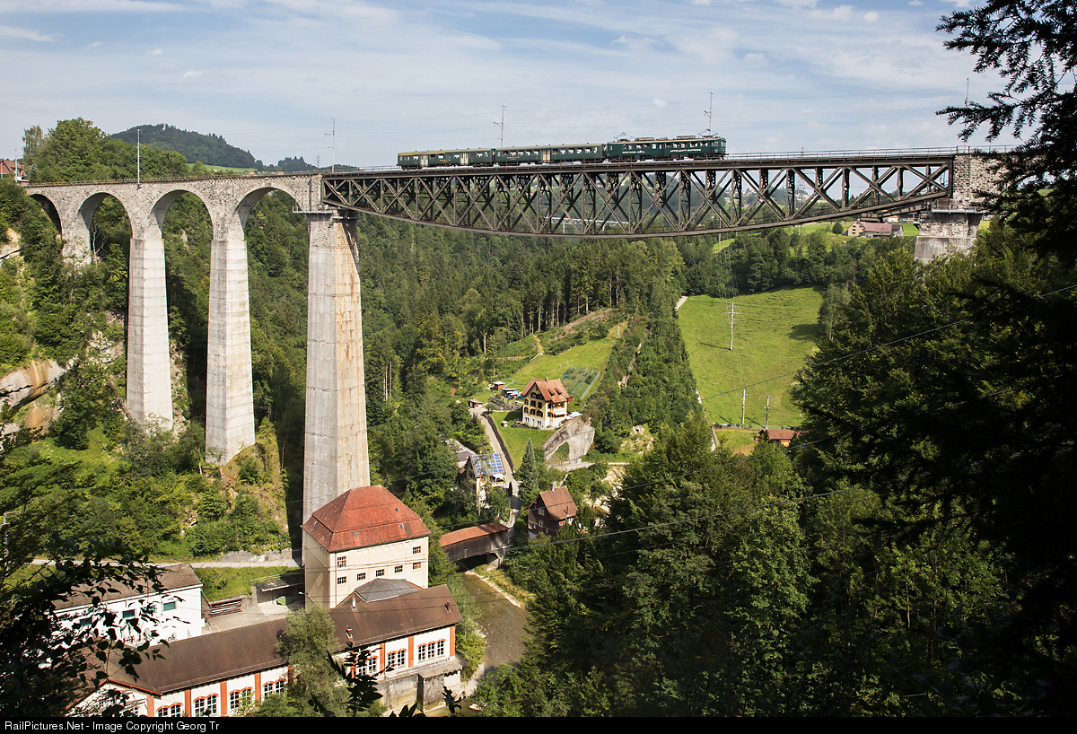 Railcar BDe 3/4 # 43 of Eurovapor Lokremise Sulgen, lettered as "Mosterei Möhl Apfelsaft- Express", with two former SBB lightweight cars (Eurovapor Sulgen), crossing the highest railway viaduct of Switzerland (99 meter high), the Sitter viaduct. This railcar was built as BCFe 3/4 in 1938 by SIG and SAAS for the Bodensee-Toggenburg-Bahn (BT). Running for the Eurovapor since 2011. Trains like this were typical some decades ago on this line.