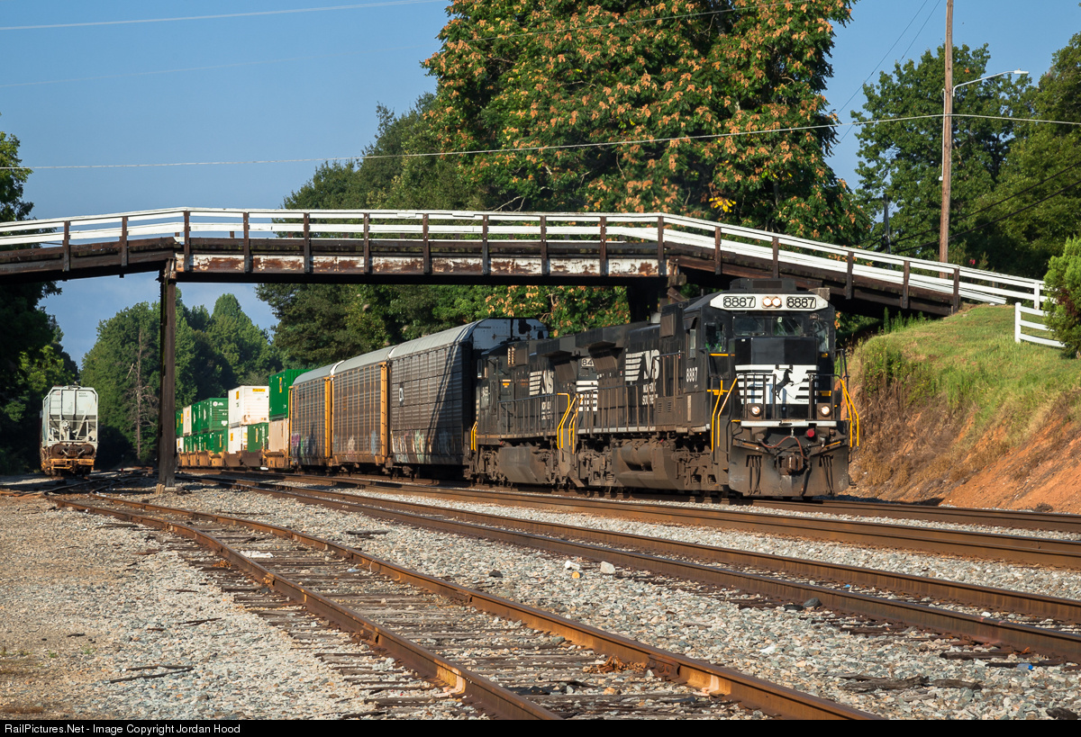 | NS 290 rumbles under the old Cobb Street wooden bridge in Lula with endangered D9-40C No. 8887 leading the way. 8887, formerly the second-to-last D9-40C ordered by NS, currently serves as the highest unit in the class since 8888's retirement and rebuild into AC44C6M No. 4056. |