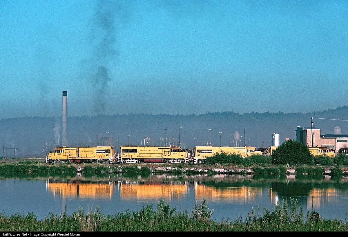 An OC&E yard job backs a trainload of logs into the sort yard at Weyco's mill for unloading.
