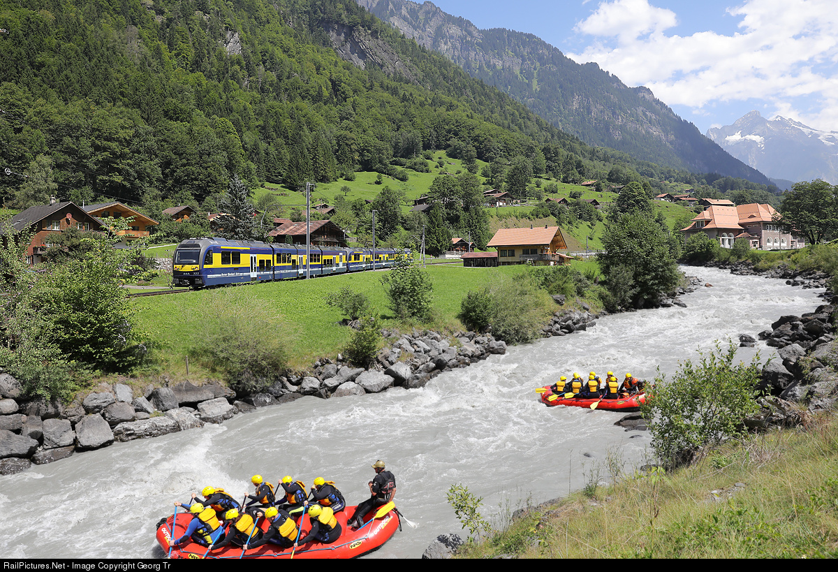 | The Schwarze Lütschine (black Lütschine) river had much water this day after a severe thunderstorm in the night before, so many wild water rafters used this fine occasion for a tremendous trip. In the background train 265 of the Berner Oberland-Bahn from Interlaken Ost to Grindelwald with new Stadler Rail trains ABDeh 8/8 # 323 and # 322, just entered the rack section. |