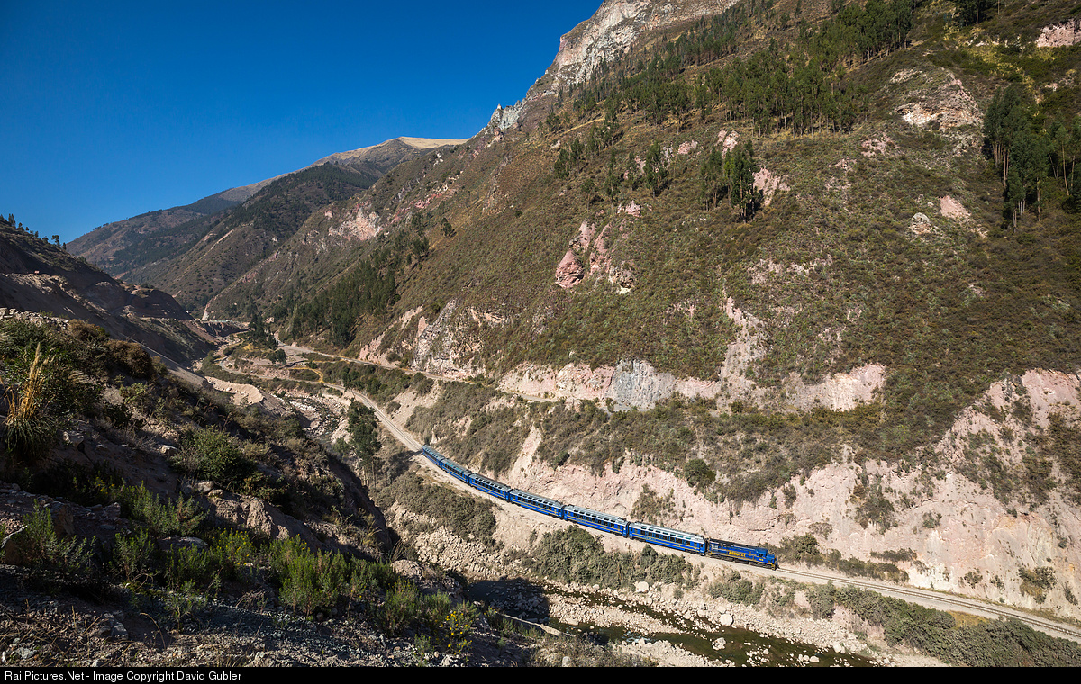 | Peru Rail's 353 hauls Vistadome 203 from Poroy (outside Cusco) to Ollantaytambo, and later to Aguas Calientes. The train has just passed the switchback near Huarocondo. |