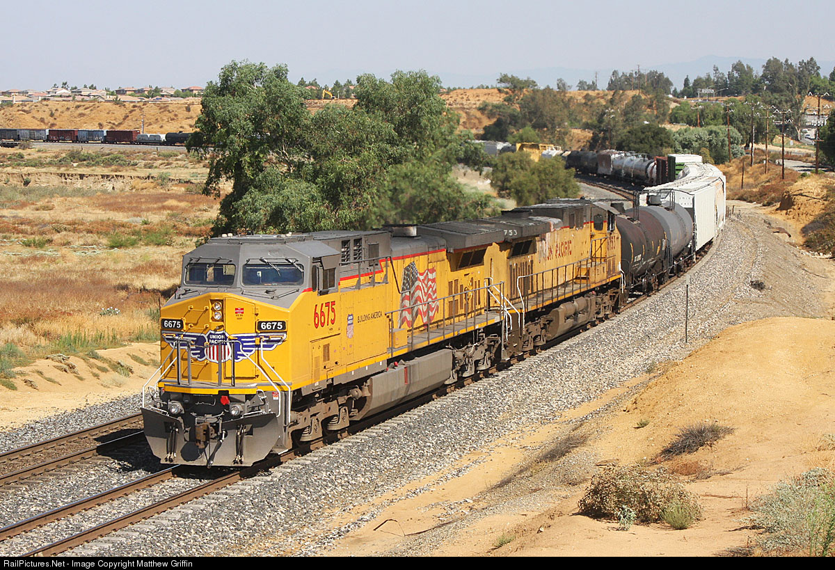| UP 6675, a jenks repaint sporting the low nose wings, brings up the rear of this Ft. Worth to West Colton manifest. |