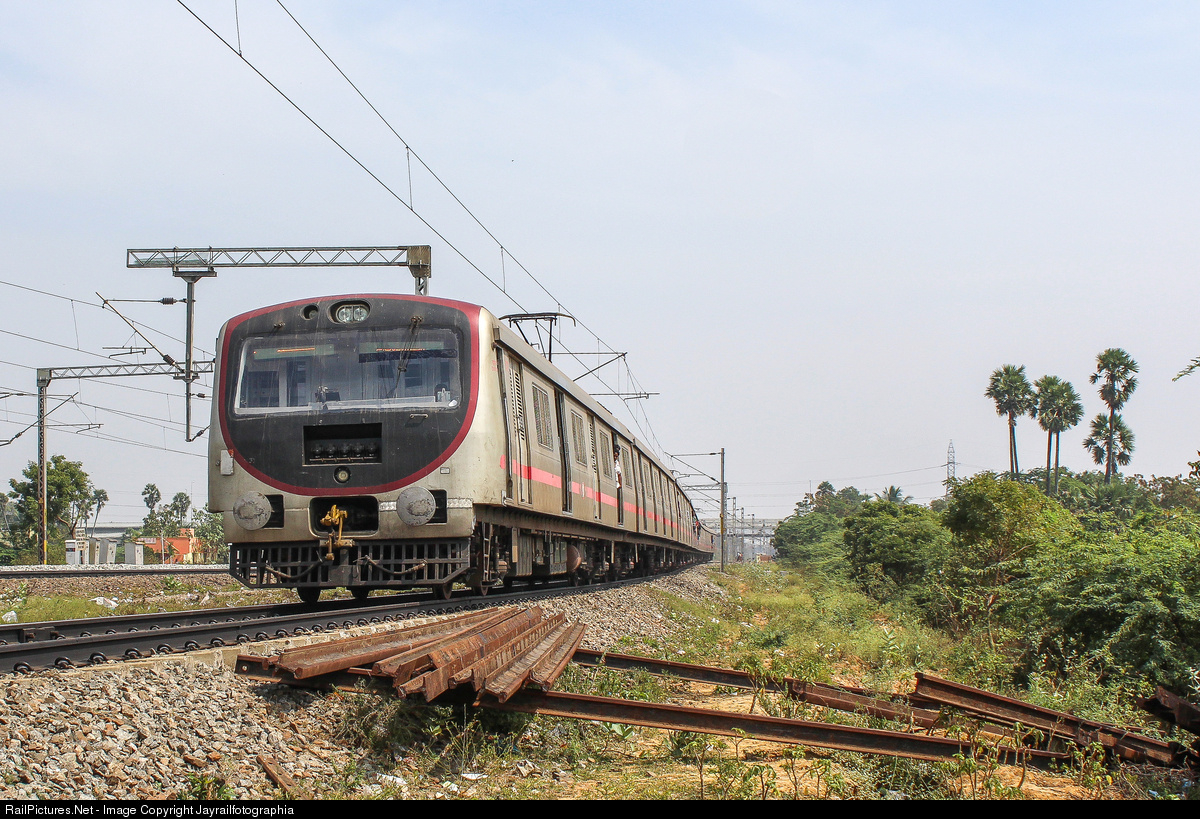 Bharat Earth Movers Limited (BEML) manufactured EMU, bound for Tiruvallur arriving at Nemilichery station |