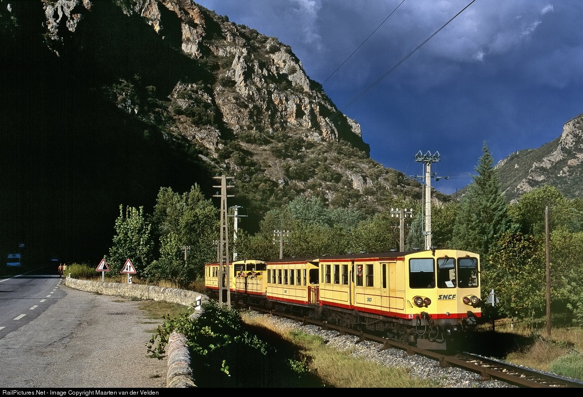 | SNCF motorcar Z 113 with trailers 20038 and 20030 and motorcar Z 102 on the "Ligne de Cerdagne". The train is running from Villefranche-Vernet-les-Bains to La Tour-de-Carol-Enveitg. In 1985 this rolling stock, bulit in 1909, was refurbished. In the train an open car that allow better enjoying the gorgeous landscape of the Pyrenees. The train is electric powered by third rail supply.