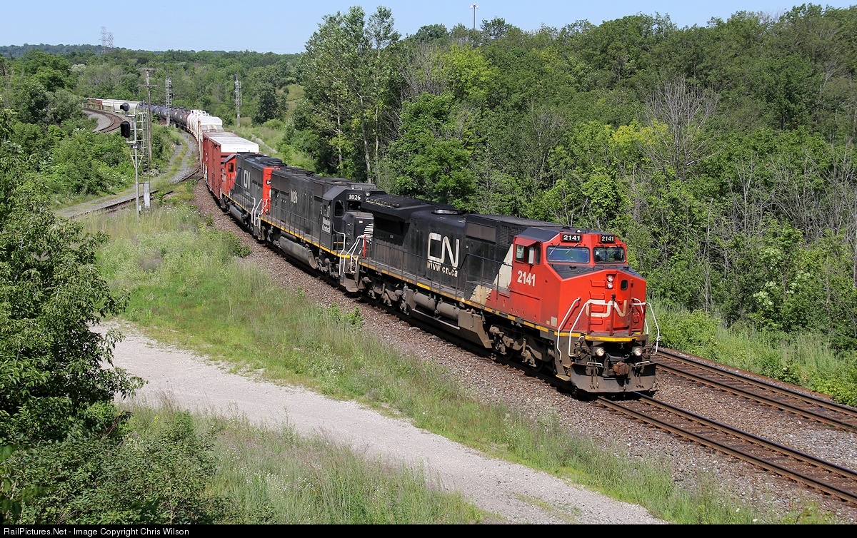 | CN 2141, IC 1026, CN 5481 hauls Gary Kirk, IN - Toronto MacMillan, ON manifest through Hamilton West. |