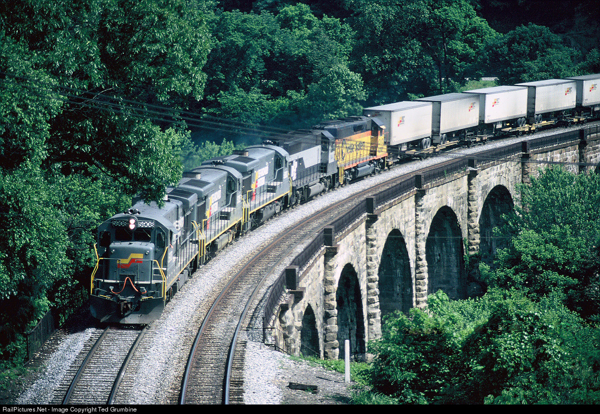 In the year 1986 B.D. (Before Drones), elevated positions could be tough to come by. Shot from the Baltimore Harbor Tunnel Thruway (I-895) overpass, this POV was only possible with the impromptu cooperation of a Maryland Toll Facilities police officer who just happened upon the scene. (Said officer will remain, for his sake, anonymous.) After I explained my business here, this very accommodating LEO, instead of immediately booting me off the bridge and issuing a citation, activated his light bar and guarded the shoulder with his cruiser until the southbound Orange Blossom Special presented itself a few minutes later.