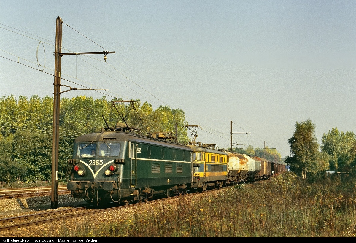 | NMBS/SNCB 2365 and 2612 with a southbound mixed freight near Sint Kathelijne-Waver. The classes 23 and 26 could be used together hauling heavy trains. The first locomotive had still is green livery, the second had a more recent one.
