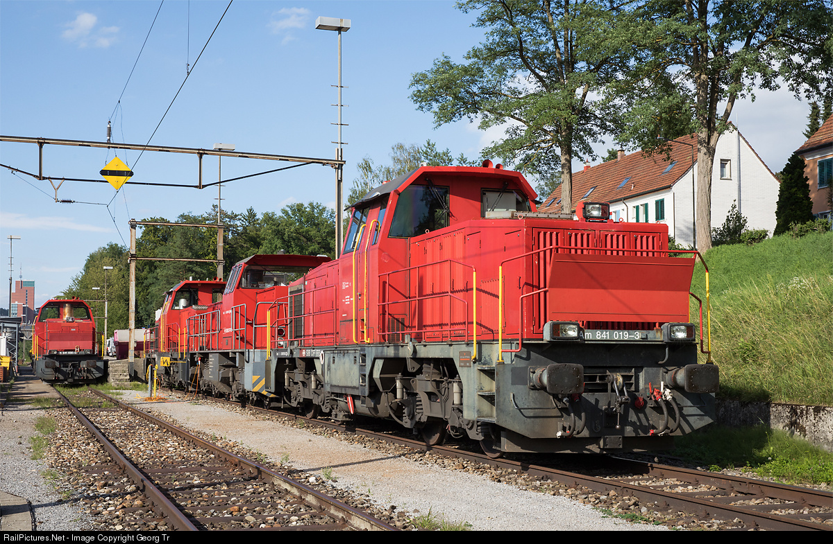 | Several diesellocomotives of SBB Infrastructure are stabled in Winterthur shunting yard this evening. From left to right are Am 841 # 030, Am 841 # 014, Am 842 # 001 and Am 841 # 019. 40 of the Am 841 type were built by GEC Alstom in Valencia/Spain from 1996 to 1997, they have a MTU prime mover of 920 kW. |