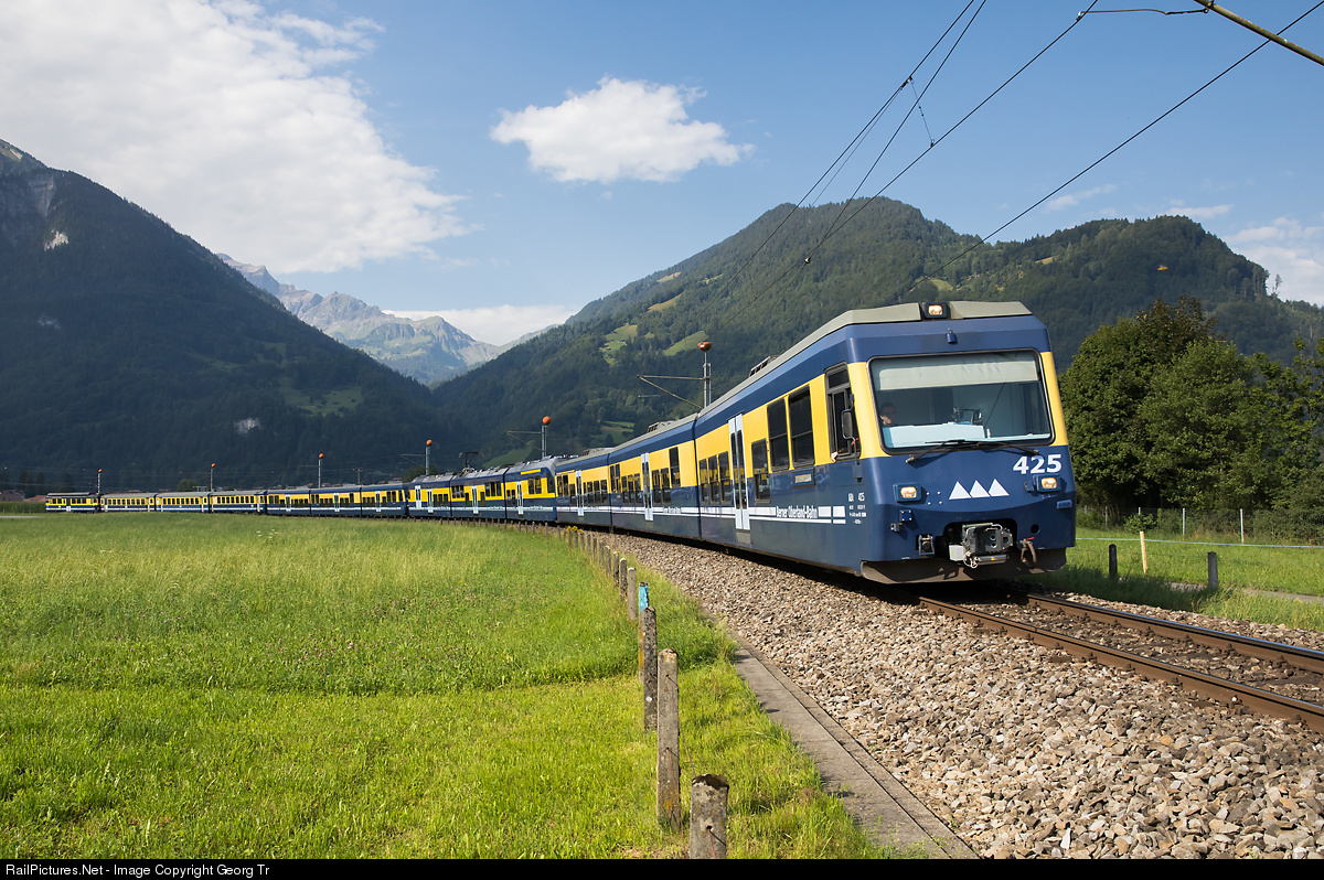 A long train of the 1 meter gauge Berner Oberland-Bahn (BOB) between Wilderswil and Interlaken Ost. Leading is articulated lowfloor cab car ABt # 425, followed by new ABDeh 8/8 # 321 fresh from Stadler Rail, coming from Grindelwald. Mechanically coupled (+GF+ coupler) on the section from Zweilütschinen till Interlaken Ost is the train from Lauterbrunnen, a push pull train with railcar ABeh 4/4 II 313 far in the rear. The cab car ABt # 425 is already rebuilt to the new Schwab coupler instead of the former +GF+ couplers.