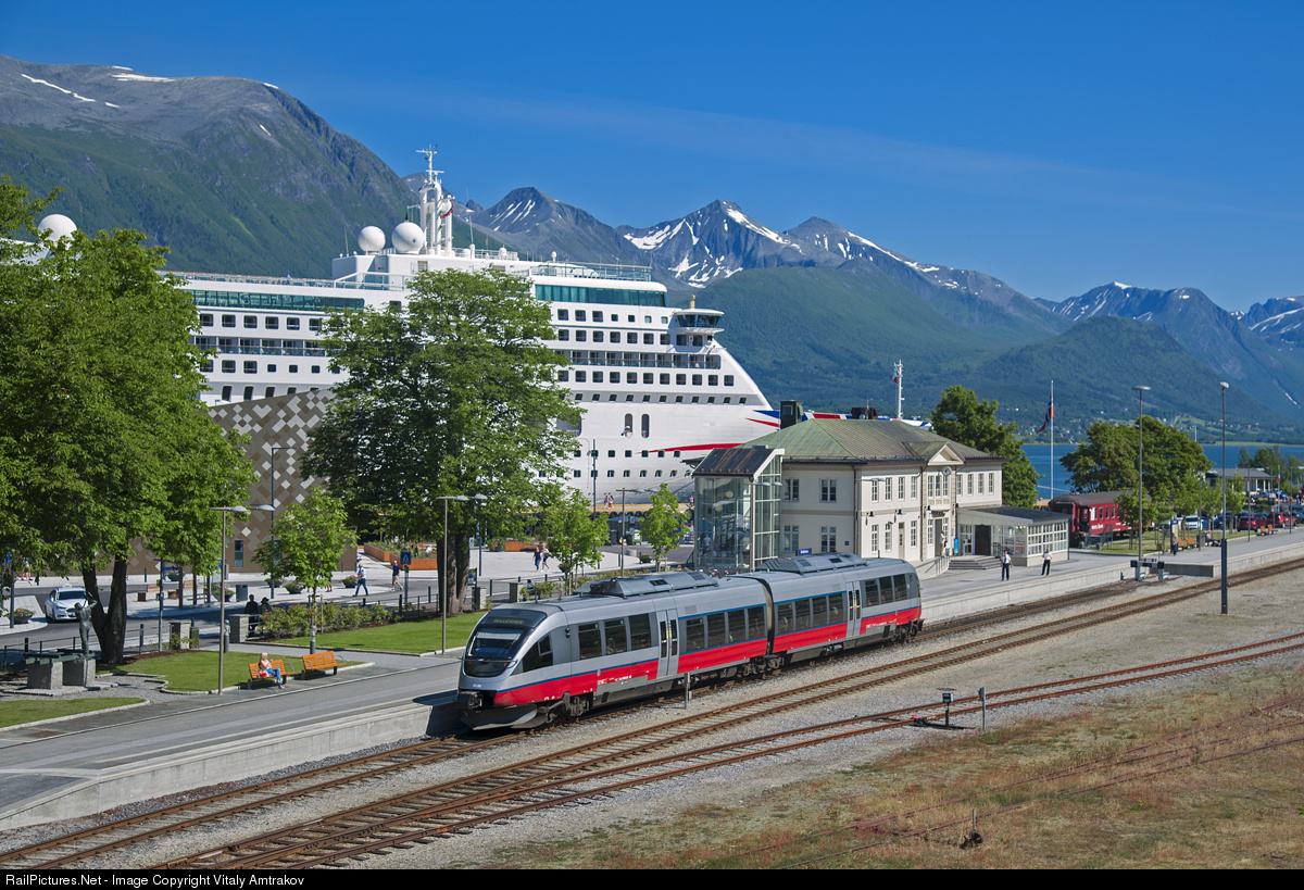 Passenger train Dombås - Åndalsnes arrived in Åndalsnes station. In the background you can see big ship Aurora