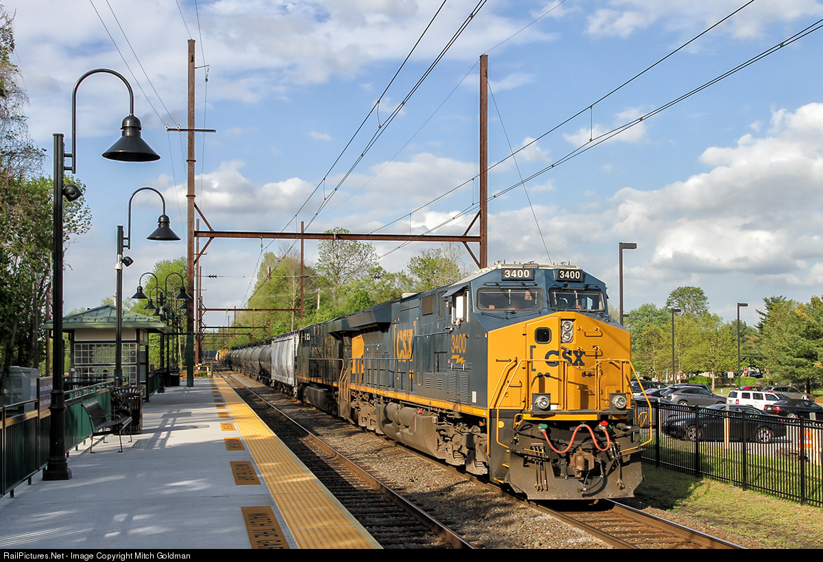 | CSX No. 3400 makes it into the database of RP.net captured here on the first of May, in 2017, westbound through Yardley, PA. To the left is SEPTA's new still under construction station upgrade which has both high and low level platforms and is located slightly west of the previous station. There are no longer any platforms to the right as that track is now solely used by CSX with SEPTA servicing both east and west bound passengers from the same track. The line becomes three track just ahead of the locomotive on towards CSX's yard in Woodbourne and continues further west where it branches off from the former Reading main at Neshaminy. |
