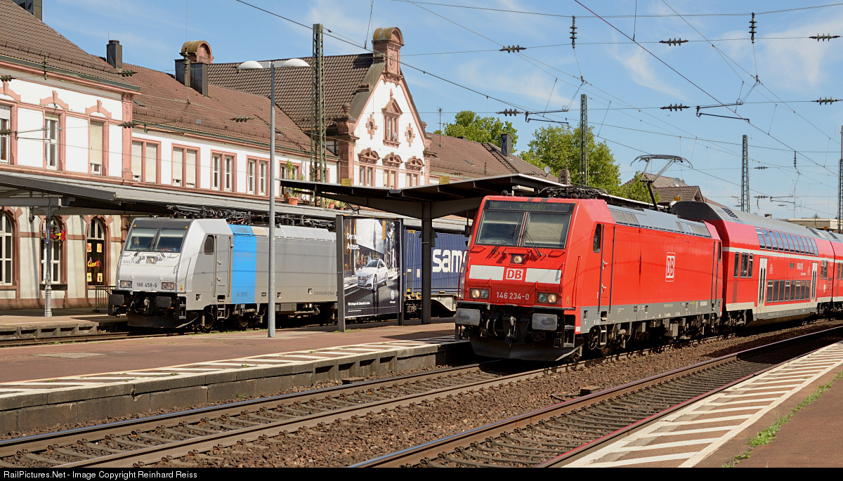 | 146 234 leaves Rastatt with RE 4723 Karlsruhe - Constance. On the left 186 458 from Railpool waits for departure with a southbound intermodal. |