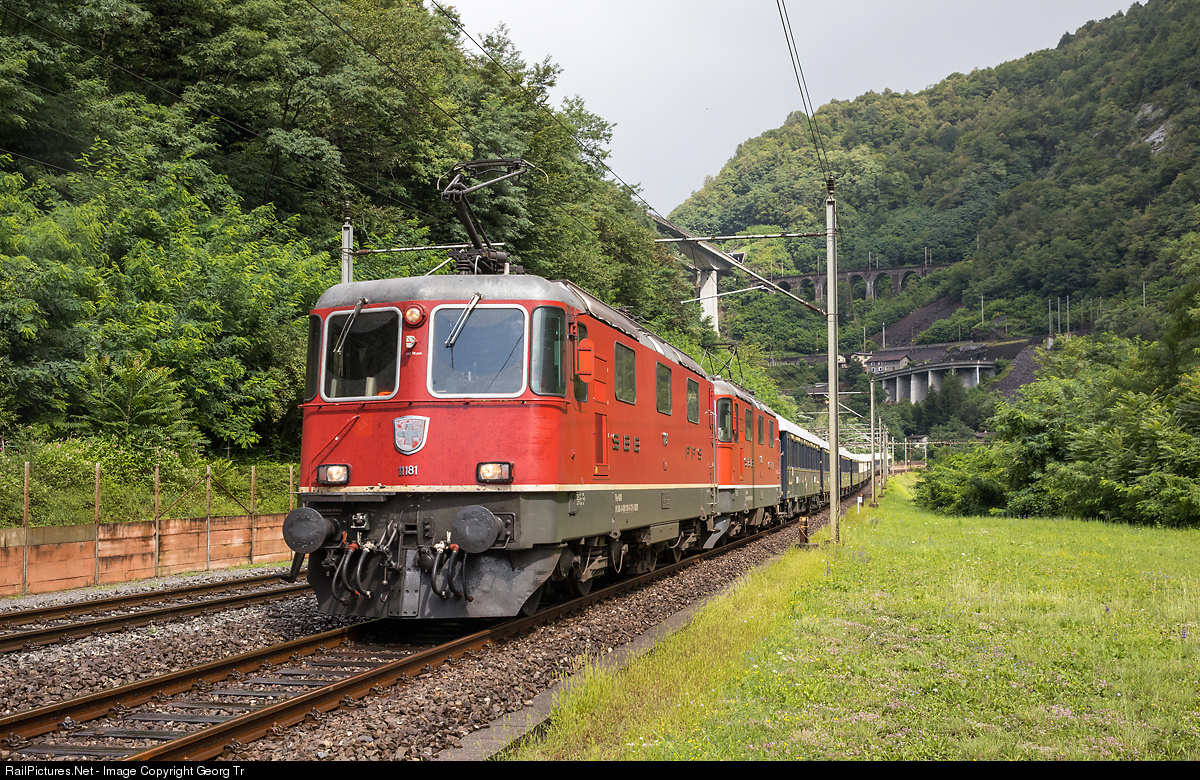 | Re 4/4 II # 11181 and another of the first series are pulling train 13467, the VENICE SIMPLON-ORIENT-EXPRESS (VSOE) from Basel SBB to Chiasso through the staircase of the Biaschina on the Gotthard south ramp. The train is running from Calais via Paris-Basel-Gotthard-Milan to Venice. The train had 11 cars only this day, usually it has 17. |