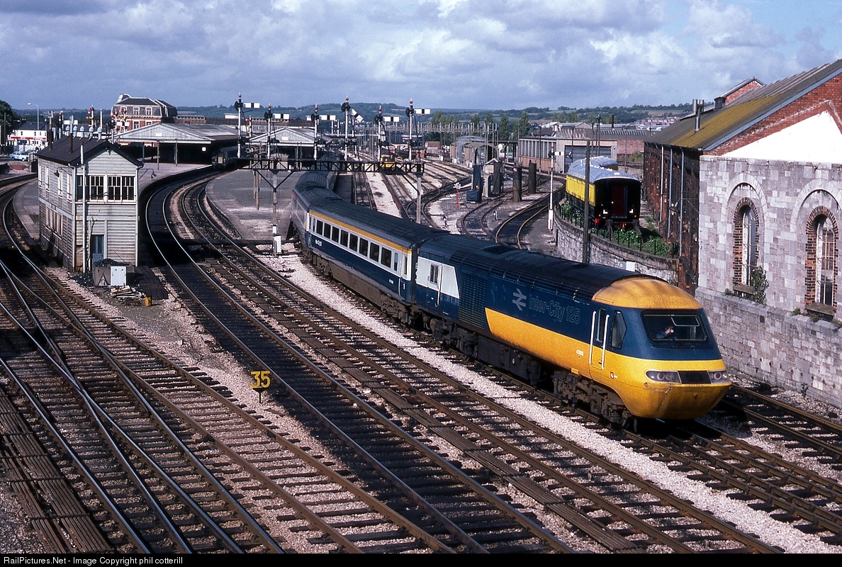 | HST power car 43166 leads a westbound cross country service out of Newton Abbot in 1982. Still plenty of semaphore signals at this time, they lasted until 1987. 43166 is still working this same route as part of Crosscountry trains fleet, although now renumbered as 43366.