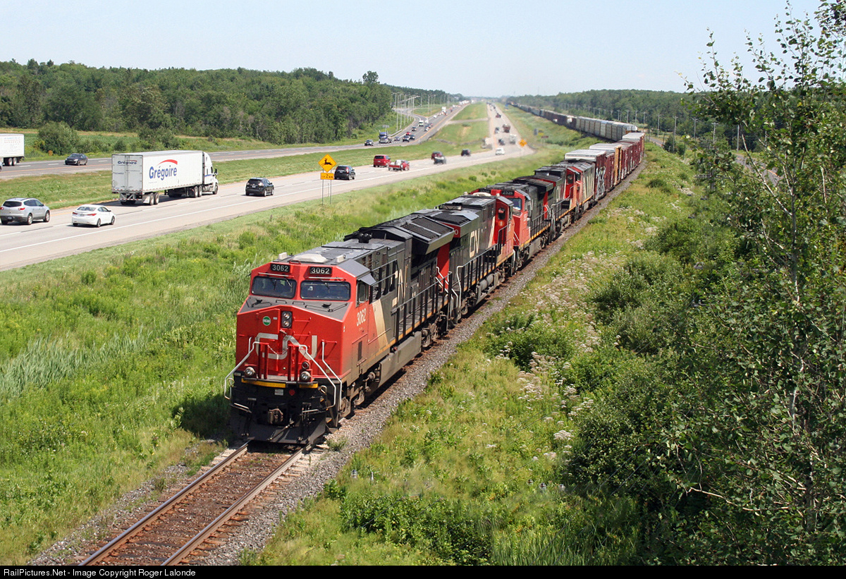 A westbound CN freight with engines ET44AC 3062, ES44AC 2950, C44-9W 2536, C44-9W 2670, C40-8M 2426. This portion of the CN main line, lies along side the Trans-Canada Highway for about 15 miles.