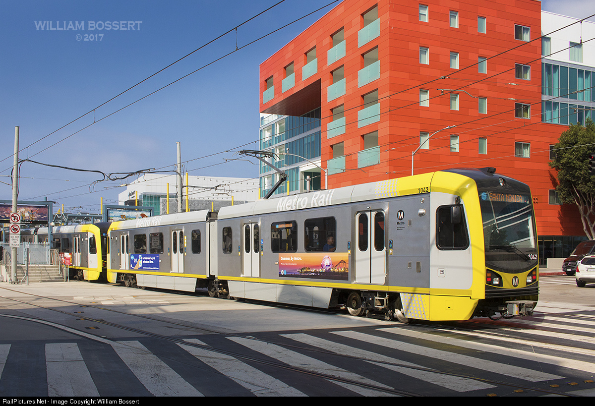 Los Angeles Metro light rail consist arrives at the Colorado/Fourth Street terminus only one block away from the Pacific ocean and the Santa Monica Pier. The cool orange modern Best Western Hotel is shown behind on a normally average sunny and 80 degree day. |