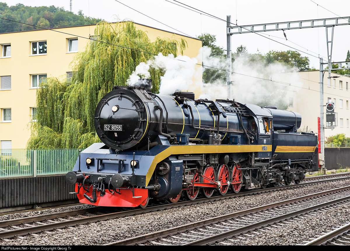 Light oil fired modernised 2-10-0 steamlocomotive 52 # 8055 of the Dampflokomotiv und Maschinenfabrik (DLM), entering Sissach on a transfer run. The locomotive is based in Schaffhausen and wears now a broad golden stripe (adhesives) instead of a bright yellow. The locomotive was originally built in 1942 by Maschinenbau AG Grafenstadt as # 1649. Reconstructed to 52 # 8055 in 1962 in the German Democratic Republic (GDR). 1992 bought by Eisenbahnfreunde Zollernbahn (EFZ). Rebuilt, modernised and converted to burn light oil in 1998 by SLM Winterthur.