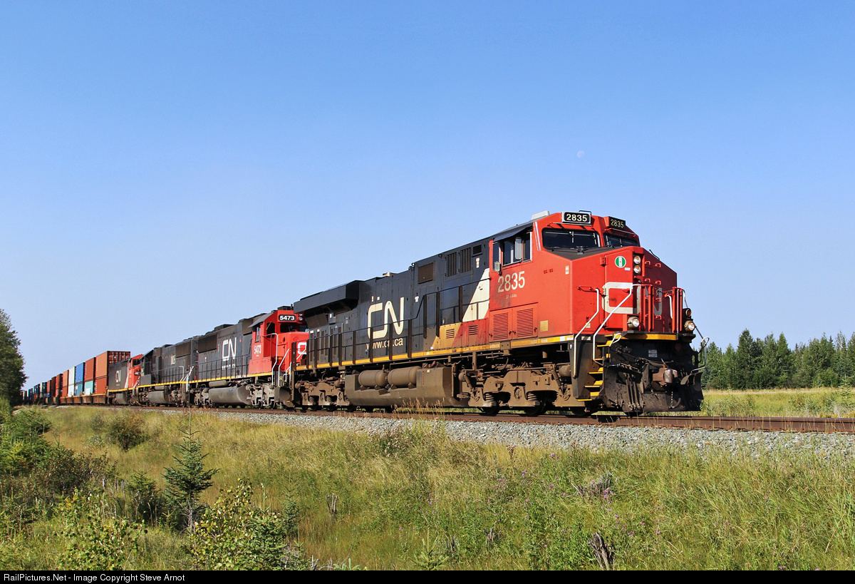 | ES44AC 2835 approaches Mile 126 on the Edson sub with an eastbound intermodal. Trailing 2835 are ex-Oakway SD60 5473, IC SD70 1025 and repainted BC Rail Dash 8-40CMu 4615. |
