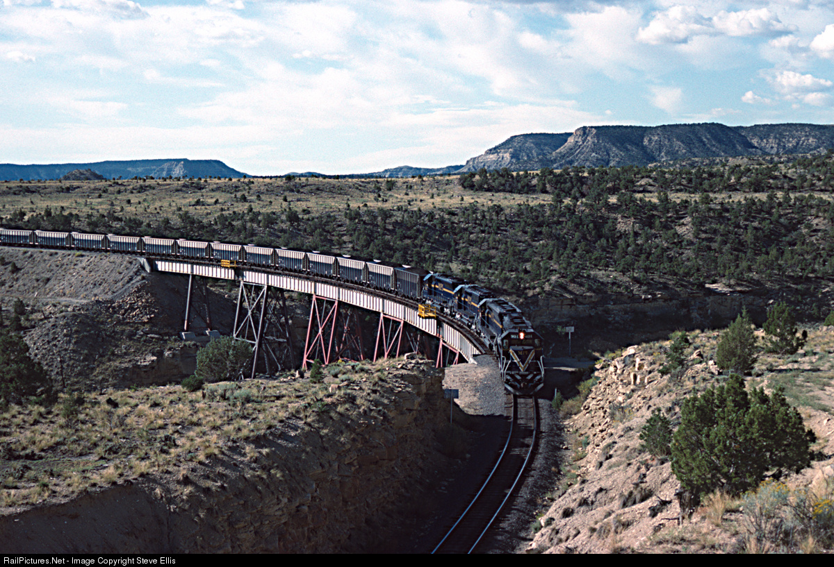 | A load coal train, loaded at the Wattis mine, crosses Utah Railway's Gordan Creek trestle. The Wattis mine was closed in 1997, and the trestle was rarely used after that point. There hasn't been a train across the trestle and the line east after a fire occurred on the trestle in 2008. |