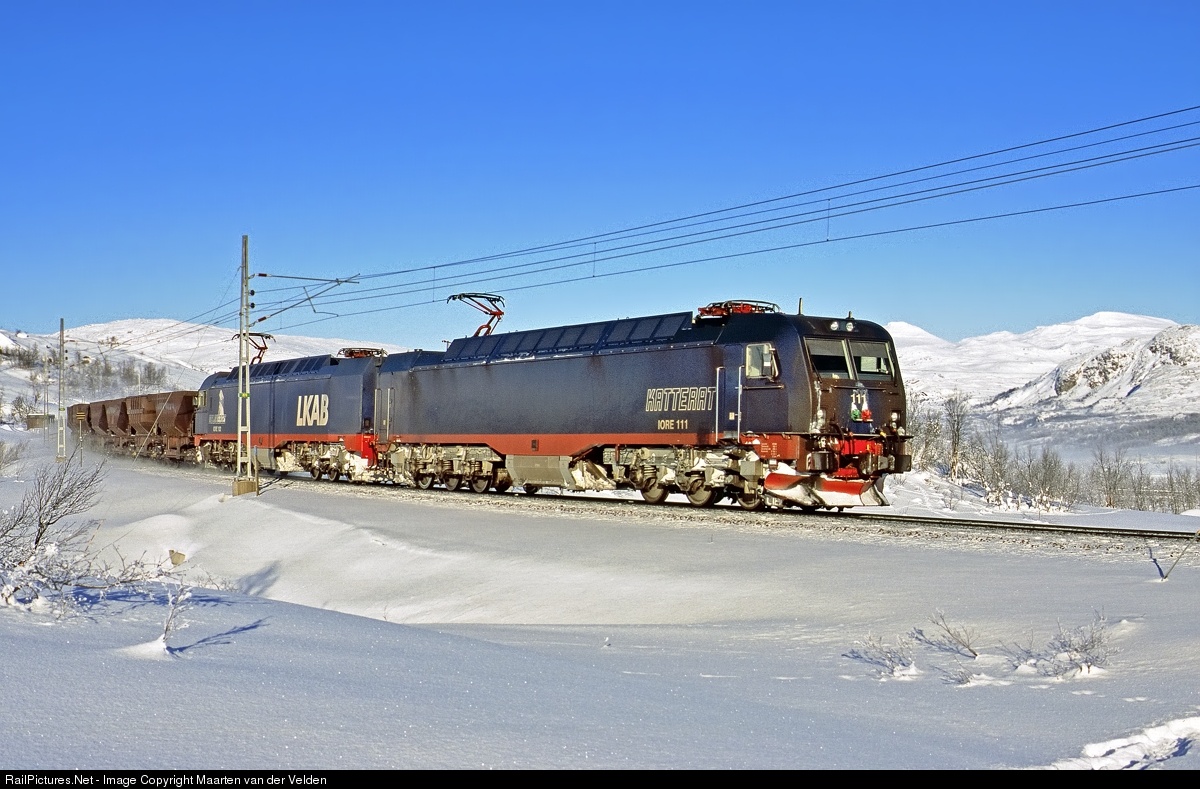 | MTAB IORE 111 "Katterat" / IORE 102 "Malmberget" with empty ore train 9909 from Narvik to Kiruna Malmbangården.