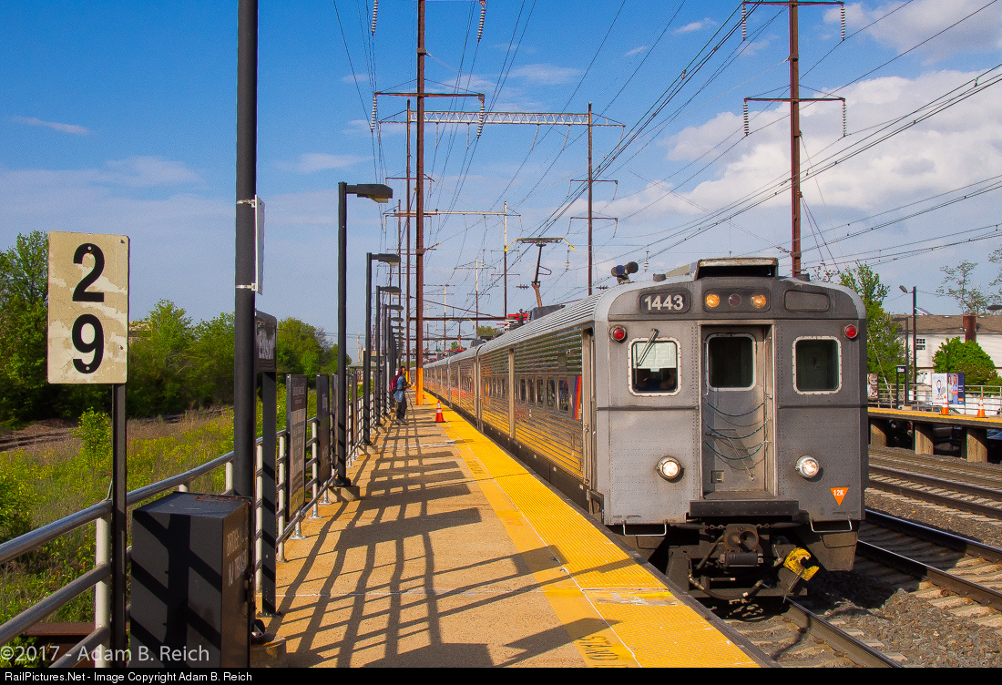 Hidden Identity: The married pair of #1442/1443 stand out as one of the few Arrow IIIs that do not feature a NJ Transit logo at the front end. Here, the pair leads Northeast Corridor Line Train 3861 into Edison Station during the evening rush on Monday, May 1, 2017.