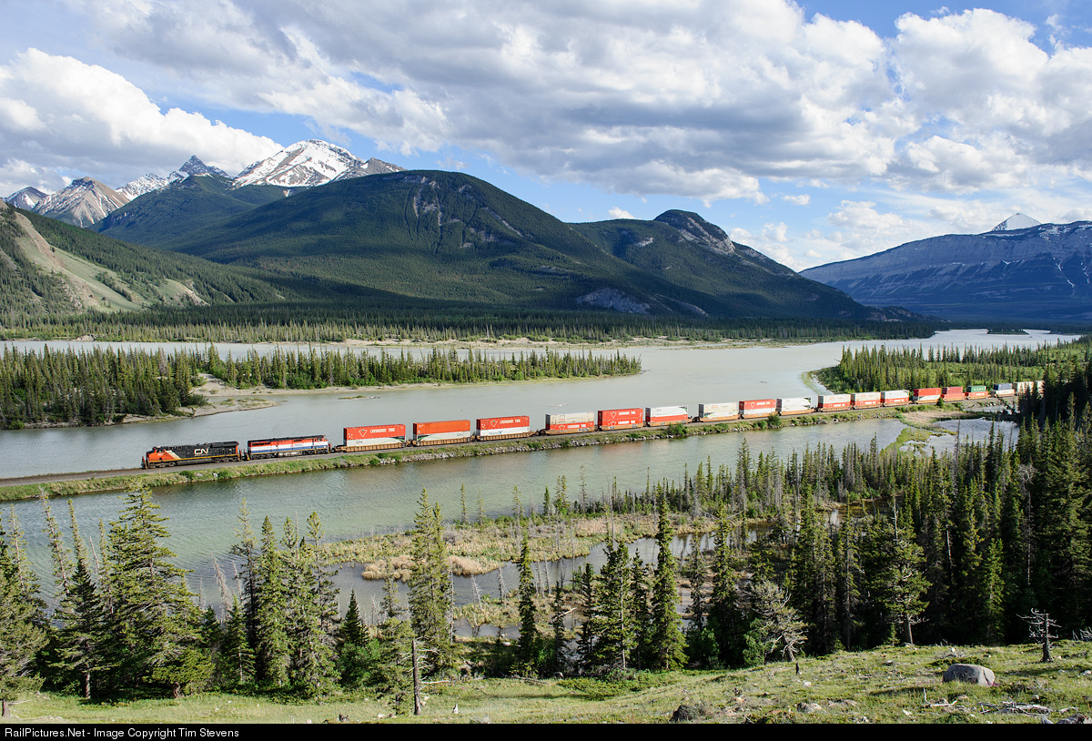 Vancouver-Winnipeg train Q108 speeds along the shores of the Athabasca River on CN's scenic Edson Sub in beautiful Jasper National Park.
