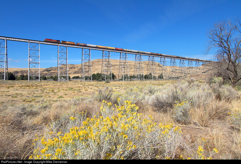 On the afternoon of September 20, 2015, a westbound Union Pacific grain train led by Canadian Pacific AC4400CW No. 8610 crosses UP’s impressive bridge over the Snake River at Joso, Washington.