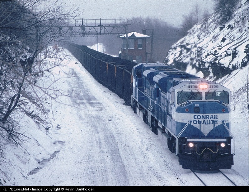 Conrail's first test of the then-new SD80MACs in coal train service proved to be too much. On Feb. 17, 1996, CR MACs 4104 and 4102 were dragging 17,000+ tons of black diamonds over the Allegheny Mountains when they stalled at AR Tower in Gallitzin, PA.
