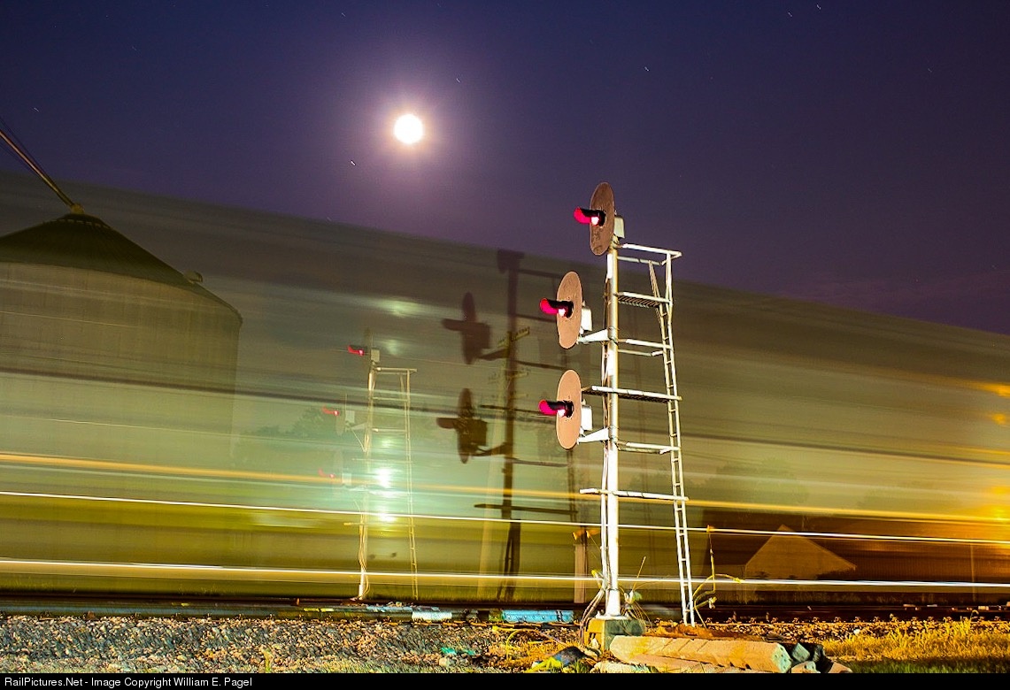As the moon rises over the small and quiet town of Cortland, IL, a westbound "Bird" breaks the silence as it does a solid 60 past the still standing C&NW Searchlights.